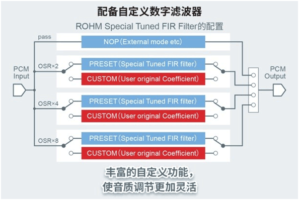 “BD34352EKV”可以對影響音質(zhì)的數(shù)字信號處理電路的數(shù)字濾波器(FIR濾波器)進行自定義。用戶不僅可以對數(shù)字濾波器選擇“預(yù)設(shè)”、“自定義”和“外部設(shè)置”等操作,還可以通過編程功能對濾波器的計算系數(shù)和過采樣率進行自定義。綜上所述,除了與“BD34301EKV”引腳兼容外,用戶還可以構(gòu)建自有的數(shù)字濾波器,輕松地為不同的音響設(shè)備進行不同的音質(zhì)調(diào)整,這將非常有助于減少客戶開發(fā)工時并實現(xiàn)制造商所追求的理想音質(zhì)效果。