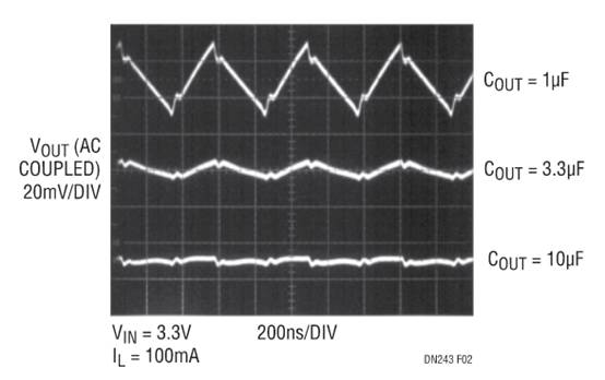 即使采用小型輸出電容器,器件的2MHz振蕩頻率也可允許低輸出紋波,圖2給出了LTC3200-5采用不同值的輸出電容器支持100mA負載電流時的輸出紋波情況。
