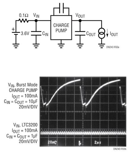 大多數(shù)可調(diào)節(jié)的充電泵DC/DC轉換器采用Burst Mode突發(fā)方式架構。雖然這種調(diào)節(jié)器結構具有最低的靜態(tài)電流,但所產(chǎn)生的輸入和輸出噪聲也最大。采用突發(fā)方式的器件,充電泵開關向輸出提供最大電流,或完全被關斷。為了對輸出進行調(diào)節(jié),遲滯比較器和基準控制了充電泵的導通和關斷。當輸出端有低頻紋波產(chǎn)生時,需要加以調(diào)節(jié)(如圖1所示)。這種一開一關的突發(fā)將導致較大的輸入紋波電流,因此,必須由輸入電源供電。輸入電源中的任何阻抗都會在輸入端產(chǎn)生電壓噪聲,這種噪聲必須由采用相同電源供電的其它電路排除掉。