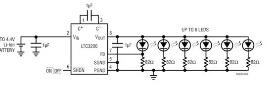 充電泵通常為手機和PDA等手持電子設備提供低功率升壓轉換。這些設備,尤其是那些含有RF通訊電路的產(chǎn)品,對噪聲十分敏感。低噪聲充電泵的一個流行應用是給白光LED供電,以便為小型彩色LCD顯示器提供背光。圖4所示的電路是一低噪聲升壓電源,最多可驅(qū)動6只白光LED,LTC3200的FB引腳用來調(diào)節(jié)流經(jīng)每只LED鎮(zhèn)流管上的LED電流。采用LTC3200,用戶可直接利用電池為背光電路提供升壓電源,免除了笨拙的低頻噪聲過濾問題。