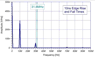 您可以將某個數(shù)字信號的頻譜成分簡化為其頻率和升時間。時鐘或者系統(tǒng)頻率建立電路的時間基準,但其邊緣率形成干擾諧波。圖 1 顯示了一個 10 MHz 方波的頻譜成分。該 10 MHz 信號的邊緣率為 10 ns。請注意,圖 1 中這些諧波的量級隨頻率降低。一般而言,這種信號的潛在 EMI 為: