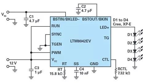 圖1. LTM8042驅動四個LED,其中 VIN = 5.75 V 至 10.25 V and IOUT = 0.5 A