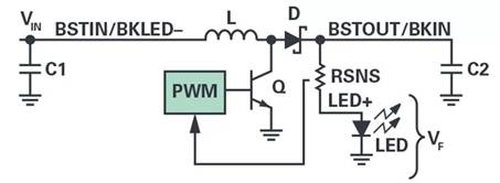 降壓拓撲用于相對較高的輸入電壓,如汽車和工業(yè)24 V電源軌。圖3顯示了 VIN > VF配置的方框圖。輸入電壓連接到BSTOUT/BKIN終端,LED陰極連接到BSTIN/BKLED–終端。當晶體管Q導通時,電流從輸入端流過LED燈串和電感L直到GND。一旦Q關斷,L上的電壓就會改變極性,二極管D會正偏,從而將LED陰極拉到輸入電壓電平以下,在LED燈串中提供設定的電流值。C5為該拓撲創(chuàng)建輸出濾波器。