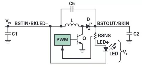 在許多商用電池和太陽能供電應用中,輸入電壓變化范圍很廣。在這些情況下,最合適使用圖4所示的降壓-升壓拓撲。輸入電壓和LED陰極連接到BSTIN/BKLED–終端。當晶體管Q導通時,電流在電感L中積聚。一旦Q關斷,L上的電壓就會改變極性,使二極管D正偏,同時電壓攀升超過輸入電平。PWM使流經(jīng) LED和C5的電流保持在設定值不變,C2充當輸出濾波器。LED燈串電壓 VF 可以低于或高于 VIN。
