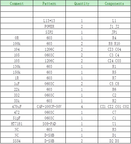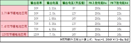 HT7181應(yīng)用于單節(jié)鋰電池升壓、雙節(jié)鋰電池升壓、三節(jié)鋰電池升壓典型參數(shù)如下: