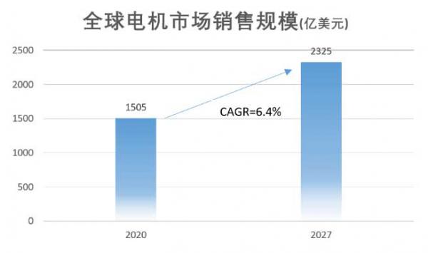 技術(shù)的進(jìn)步推動(dòng)市場向前高速發(fā)展,根據(jù)市場研究機(jī)構(gòu)Grand View Research的統(tǒng)計(jì)數(shù)據(jù),2020年全球電機(jī)市場銷售規(guī)模已經(jīng)達(dá)到1505億美元,從2020年至2027年全球電機(jī)市場銷售規(guī)模有望以6.4%的年復(fù)合增長率繼續(xù)攀升,到2027年達(dá)到2325億美元。