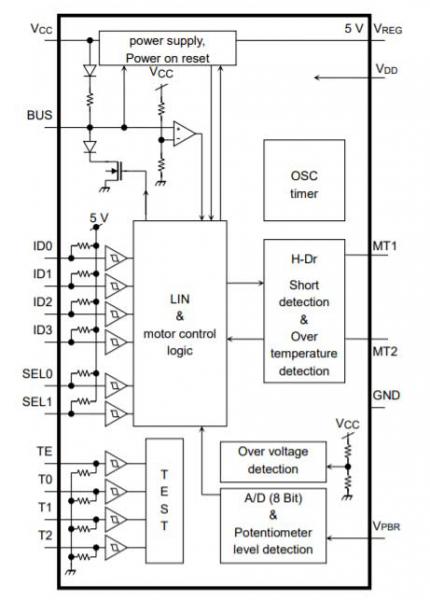 圖3是該驅(qū)動(dòng)器的內(nèi)部框圖,該驅(qū)動(dòng)器基于本地互連網(wǎng) (LIN) 1.3協(xié)議規(guī)范,能夠以19200bps / 9600bps / 4800bps / 2400bps通訊速率與LIN總線進(jìn)行數(shù)據(jù)通訊,最多可連接16個(gè)設(shè)備作為單個(gè)總線上的從設(shè)備。