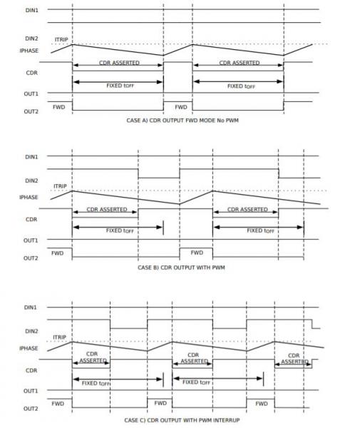 此外,MAX22203集成電流驅(qū)動(dòng)調(diào)節(jié) (CDR) ,電流檢測外部控制器可出于各種原因使用CDR引腳,如下圖7展示了當(dāng)電機(jī)向前旋轉(zhuǎn)且DIN2保持在高電平 (情況A) 或DIN2切換時(shí) (情況B和C) ,CDR功能的具體行為。比如,引腳占空比可用于檢測停頓條件。