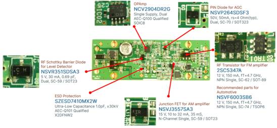 一個(gè)典型的AM/FM RF前端電路(圖2)含多個(gè)分立半導(dǎo)體,用于低噪聲放大器(LNA)、自動(dòng)增益控制(AGC)、穩(wěn)壓和靜電放電(ESD)保護(hù)功能。安森美(onsemi)的符合車規(guī)的寬廣產(chǎn)品組合提供了整個(gè)塊中所需要的所有器件。NSVJ3557SA3和NSVJ3910SB3高壓結(jié)場(chǎng)效應(yīng)晶體管(JFET)提供強(qiáng)固的AM LNA方案,使5 V驅(qū)動(dòng)器實(shí)現(xiàn)9.5 dB的功率增益。