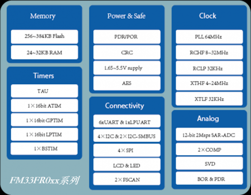 FM33FR0系列基于32 ARM Cortex-M0內(nèi)核,最高主頻為48MHz,提供最大384KB Program FLASH8KB Data FLASH50萬次擦寫),flash支持ECC;最大32KB RAM,帶有奇偶校驗;支持LQFP44 / LQFP48 / LQFP64 / LQFP80 / LQFP100多種封裝形式。