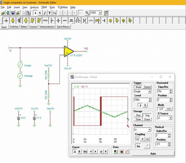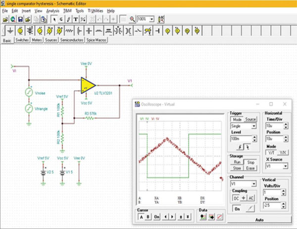 圖 1:TINA-TI 仿真說明了比較器的基本工作原理:在比較器的同相輸入端施加正弦波,而反相輸入端連接參考零伏(地)。(圖片來源:Digi-Key Electronics)