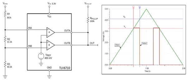 所示窗口電路采用了 Texas Instruments 的 TLV6710DDCR 雙電壓比較器。TLV6710 包含兩個(gè)用于高電壓應(yīng)用的高精度比較器。供電電壓可以在 1.8 至 36 伏之間。該器件包含一個(gè) 400 mV 內(nèi)部 DC 參考源。如圖所示,比較器輸出采用開漏連接,可以通過一個(gè)公共上拉電阻將其輸出連接在一起,進(jìn)行邏輯“或”運(yùn)算。比較器已接線,以便將參考電壓施加到其中一個(gè)比較器(比較器 A)的反相輸入端,非反向輸入施加到另一個(gè)比較器(比較器 B)。通過由電阻 R1、R2 和 R3 組成的分壓器施加輸入電壓,分壓器將下限閾值電壓設(shè)置為 3.3 伏,上限閾值電壓設(shè)置為 4.1 伏。當(dāng)輸入 VMON 在窗口內(nèi)時(shí),比較器輸出為高電平(3.3 伏)。比較器 A 指示輸入電壓低于 4.1 伏,比較器 B 指示輸入電壓超過 3.3 伏。TLV6710 的內(nèi)部額定電壓遲滯為 5.5 mV,有助于抑制噪聲和小毛刺。