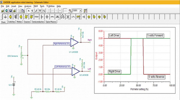 窗口可用于機(jī)器人技術(shù),通過光線和兩個(gè) CDS 光電管來控制機(jī)器人的移動(dòng)方向。例如,硫化鎘 (CDS) 光電池在燈光下會(huì)改變電阻,黑暗環(huán)境下電阻較高而燈光下則電阻較小。TINA-TI 仿真使用 Texas Instruments LM393BIPWR 雙比較器說明了這一原理(圖 5)。