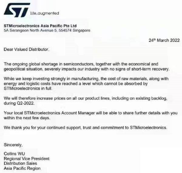 意法半導(dǎo)體在致其分銷合作伙伴的信中說道,不利的經(jīng)濟(jì)條件和地理條件使得原材料成本、能源成本和物流成本不斷增加,因此公司已經(jīng)無法消化其總支出,只能選擇漲價。
