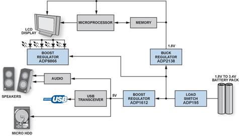 圖1顯示采用兩節(jié)串聯(lián)的AA電池供電的典型低功耗系統(tǒng)。電 可用輸出范圍約為1.8 V至3.4 V,而IC工作時(shí)需要1.8 V和5.0 V 電壓。升壓轉(zhuǎn)換器可在不增加電池單元數(shù)量的情況下提升電 壓,從而為WLED背光、微型硬盤驅(qū)動(dòng)器、音頻設(shè)備和USB外 設(shè)供電,而降壓轉(zhuǎn)換器可為、內(nèi)存和顯示器供電。