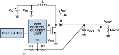 注意,開關(guān)調(diào)節(jié)器既可以連續(xù)工作,也可以斷續(xù)工作以連續(xù)導(dǎo)通模式 (CCM), 工作時(shí),電感電流不會(huì)降至0;以斷續(xù)導(dǎo)通模式 (DCM), 工作時(shí),電感電流可以降至0。 電流紋波,在圖2中顯示為ΔIL 使用公式ΔIL = (VIN ? tON)/L.計(jì)算。平均電感電流流入負(fù)載,而紋波電流流入輸出電容。