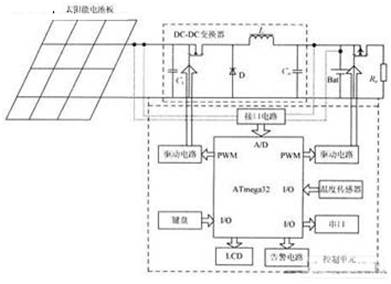 電壓檢測(cè)電路用于識(shí)別光照的強(qiáng)度和獲取蓄電池端電壓。溫度檢測(cè)電路用于蓄電池充電溫度補(bǔ)償。該系統(tǒng)采用PWM方式驅(qū)動(dòng)充電電路,控制蓄電池的最優(yōu)充放電。電池板分組切換控制電路用于不同光強(qiáng)度和充電模式下電池板的切換,該系統(tǒng)實(shí)現(xiàn)對(duì)3組電池板陣列控制。負(fù)載電流檢測(cè)電路用于過(guò)流保護(hù)及負(fù)載功率檢測(cè)。狀態(tài)顯示電路用于系統(tǒng)狀態(tài)的顯示,包括電壓、負(fù)載狀況及充放電狀態(tài)的顯示。串行口上傳數(shù)據(jù)電路用于系統(tǒng)運(yùn)行參數(shù)的上傳,實(shí)現(xiàn)遠(yuǎn)程監(jiān)控。鍵盤輸入電路用于充電模式設(shè)定及LCD背光開(kāi)啟。該控制器在有陽(yáng)光時(shí)接通電池板,向蓄電池充電;當(dāng)夜晚或陰天陽(yáng)光不足時(shí),蓄電池放電,以保證負(fù)載不停電。