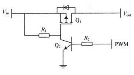 設(shè)計(jì)的控制器屬于串聯(lián)型,即控制充電的開(kāi)關(guān)是串聯(lián)在電池板與蓄電池之間的。串聯(lián)型控制器相對(duì)于并聯(lián)型控制器能夠更有效地利用太陽(yáng)能,減少系統(tǒng)的發(fā)熱量。設(shè)計(jì)中用MOSFET實(shí)現(xiàn)開(kāi)關(guān)。MOSFET是電壓控制單極性金屬氧化物半導(dǎo)體場(chǎng)效應(yīng)晶體管,所需驅(qū)動(dòng)功率較小。而且MOSFET只有多數(shù)載流子參與導(dǎo)電,不存在少數(shù)載流子的復(fù)合時(shí)間,因而開(kāi)關(guān)頻率可以很高,特別適合作為PWM控制充電開(kāi)關(guān)。為此,設(shè)計(jì)中采用P溝道MOSFET。P溝道MOSFET的導(dǎo)通電壓Vth<0,由圖4可以實(shí)現(xiàn)MOSFET的驅(qū)動(dòng)。當(dāng)Q2導(dǎo)通時(shí),由于Q2的Vce很小,可以認(rèn)為Q1的G極接地,Vgs<0,當(dāng)Vin達(dá)到一定值時(shí),Q1導(dǎo)通。