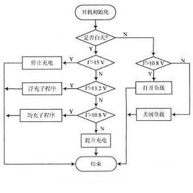 主程序主要完成對(duì)I/O、定時(shí)器和PWM的初始化,同時(shí)根據(jù)電池板和蓄電池的狀態(tài)調(diào)用相應(yīng)的充放電子程序?刂破鲄(shù)的測(cè)量主要由中斷服務(wù)程序完成。
