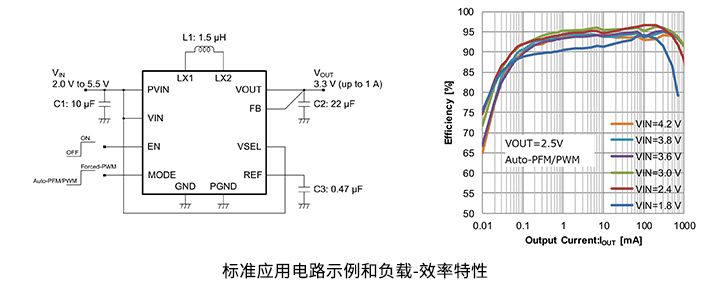 -在升降壓電源IC中消耗電流達(dá)到業(yè)界先進(jìn)的2.8µA Typ(VIN=3.6V、 Auto-PFM/PWM、無負(fù)載)
