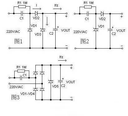 電容降壓式簡易電源的基本電路如圖1,C1為降壓電容器,D2為半波整流二極管,D1在市電的負(fù)半周時給C1提供放電回路,D3是穩(wěn)壓二極管,R1 為關(guān)斷電源后C1的電荷泄放電阻。在實(shí)際應(yīng)用時常常采用的是圖2的所示的電路。當(dāng)需要向負(fù)載提供較大的電流時,可采用圖3所示的橋式整流電路。整流后未經(jīng)穩(wěn)壓的 直流電壓一般會高于30伏,并且會隨負(fù)載電流的變化發(fā)生很大的波動,這是因?yàn)榇祟愲娫磧?nèi)阻很大的緣故所致,故不適合大電流供電的應(yīng)用場合。