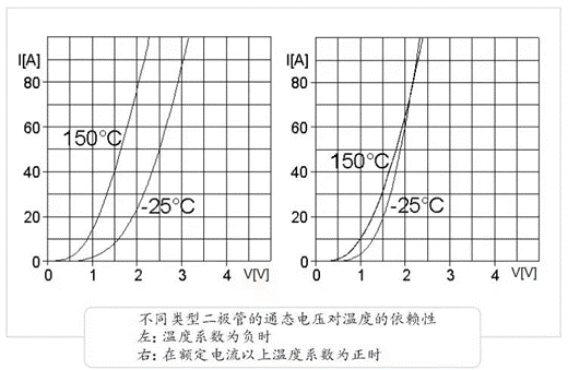 判斷一個(gè)二極管是否適合并聯(lián)的重要參數(shù)是其通態(tài)電壓對(duì)溫度的依賴(lài)性。如果通態(tài)電壓隨溫度的增加而下降,則它具有負(fù)的溫度系數(shù)。對(duì)于損耗來(lái)說(shuō),這是一個(gè)優(yōu)點(diǎn)。