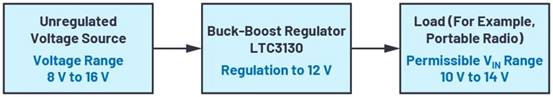 圖1所示為這類應用的系統(tǒng)示意圖。便攜式無線電設(shè)備由電池提供電壓。負載可以接受介于10 V和14 V之間的電壓,但電壓源的輸出范圍可能為8 V至16 V。那么內(nèi)插的降壓-升壓穩(wěn)壓器可以在輸出端將電壓轉(zhuǎn)換為12 V。如果電源電壓略低于12 V,轉(zhuǎn)換器采用升壓模式工作,如果電源電壓高于12 V,則采用降壓模式工作。