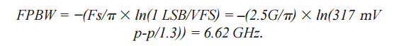 一般而言,一個(gè)ADC的內(nèi)部前端需要在半個(gè)周期或采樣時(shí)鐘周期內(nèi)建立(0.5/Fs),這樣才能提供對(duì)內(nèi)模擬信號(hào)捕捉的精確表達(dá)。因此,對(duì)于一個(gè)12位ADC(采樣速率為2.5 GSPS,滿量程輸入范圍為1.3 V p-p)來說,全功率帶寬(FPBW)可通過下列瞬態(tài)公式推導(dǎo):