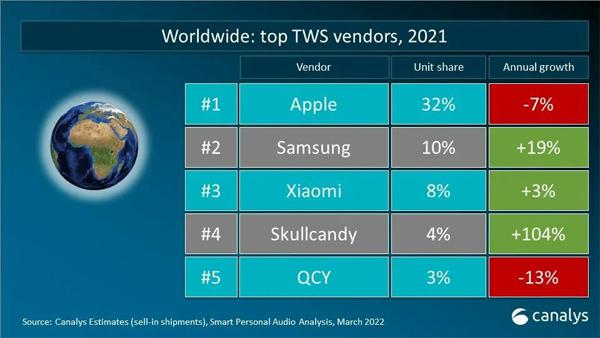 2021 年 TWS 耳機(jī)全球出貨量達(dá) 2.9 億臺(tái),蘋(píng)果、三星、小米、Skullcandy、QCY 前五