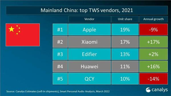 中國(guó)大陸市場(chǎng)方面,蘋(píng)果、小米、漫步者(Edifier)、華為、QCY 位列前五位,市場(chǎng)份額分別為 19%、17%、13%、11%、10%。
