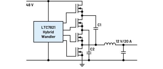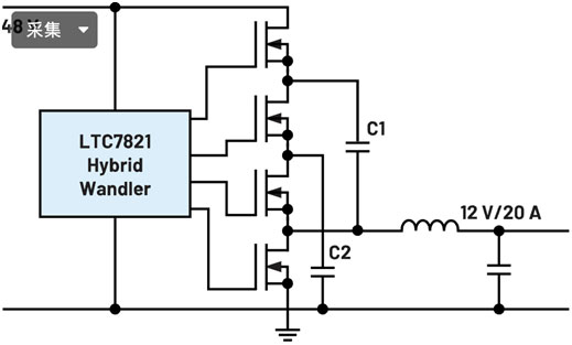 除了這些明顯的調(diào)整之外,還有涉及開關(guān)穩(wěn)壓器拓?fù)浣Y(jié)構(gòu)的方法。LTC7821 混合轉(zhuǎn)換器就是一個(gè)例子。它將電荷泵與降壓轉(zhuǎn)換器相結(jié)合,在電源電壓轉(zhuǎn)換為較低電壓時(shí)可實(shí)現(xiàn)非常高的效率。對(duì)于48 V至12 V轉(zhuǎn)換,在20 A輸出電流和500 kHz開關(guān)頻率的條件下,可以實(shí)現(xiàn)97.3%的轉(zhuǎn)換效率。使用標(biāo)準(zhǔn)商用硅MOSFET可產(chǎn)生240 W的輸出功率。圖1說明了混合降壓轉(zhuǎn)換概念。損耗之所以如此之低,是因?yàn)殡姾杀玫墓ぷ餍蕵O高,而且由于電源電壓已經(jīng)減半,下游降壓轉(zhuǎn)換器可以在最優(yōu)電壓范圍內(nèi)工作。