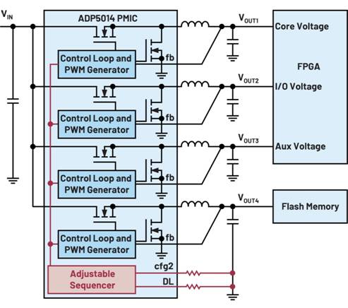 圖4. 作為范例,ADP5014是一款提供四個(gè)不同輸出電壓的高集成度開關(guān)穩(wěn)壓器
