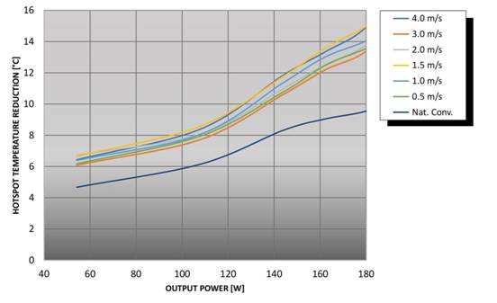 另一個變數(shù)是 DC/DC 轉(zhuǎn)換器是否安裝了基板。通過強制風(fēng)冷,一般可選擇使用“開放式框架”部件,或配備基板的部件。雖然可能沒有傳導(dǎo)冷卻,但基板具有散熱作用,并能夠提供一個平坦的表面來散熱,因此它的效果是有益于散熱。例如,F(xiàn)lex Power Modules 的數(shù)據(jù)表明,在高負載和高氣流速度下,安裝基板與未安裝基板相比,PKU4213D 產(chǎn)品熱區(qū)最多可降低 15℃ 左右(圖 3)。