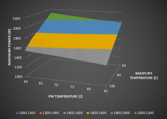Flex Power Modules 正在推廣另一種確定 DC/DC 可用功率的替代方法,它是通過提供與模塊本身限制更密切相關(guān)的數(shù)據(jù)實現(xiàn)。在實際應(yīng)用中,如果指定了引腳和基板最高溫度,則 通過Flex Power Modules收集的 DC/DC 內(nèi)部熱阻和物理測量數(shù)據(jù)可以更準確地了解最大可用功率,這樣能夠?qū)τ脩?PCB 結(jié)構(gòu)及其熱阻和氣流特性更加確定。高溫下的損耗變化會自動包含在內(nèi),因為指示的最大可用功率是通過增大負載使關(guān)鍵組件熱區(qū)溫度達到最大值來計算。展示數(shù)據(jù)的最好方式是以三軸圖呈現(xiàn),如圖 4 所示,其中所用為Flex Power Modules的BMR491。最終用戶可以簡單地測量應(yīng)用中引腳和基板溫度,并查看可用的功率多大。這與僅根據(jù)降額曲線提供氣流形成鮮明對比,降額曲線可能過于保守,或者冗余不足以將 DC/DC 轉(zhuǎn)換器中的結(jié)溫保持在安全范圍內(nèi)。在最壞情況下,即使溫度不會高到足以觸發(fā)電路保護,但仍會超過推薦值,從而導(dǎo)致可靠性降低和使用壽命縮短。