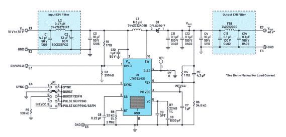 我們可以使用LT8362升壓轉(zhuǎn)換器構(gòu)建一個(gè)高性能電源,該轉(zhuǎn)換器采用60 V、2 A開關(guān),工作頻率最高可達(dá)2 MHz,且采用3 mm × 3 mm小型封裝。下面的電路基于標(biāo)準(zhǔn)的LT8362演示板 DC2628A, 其原理圖如圖1所示。