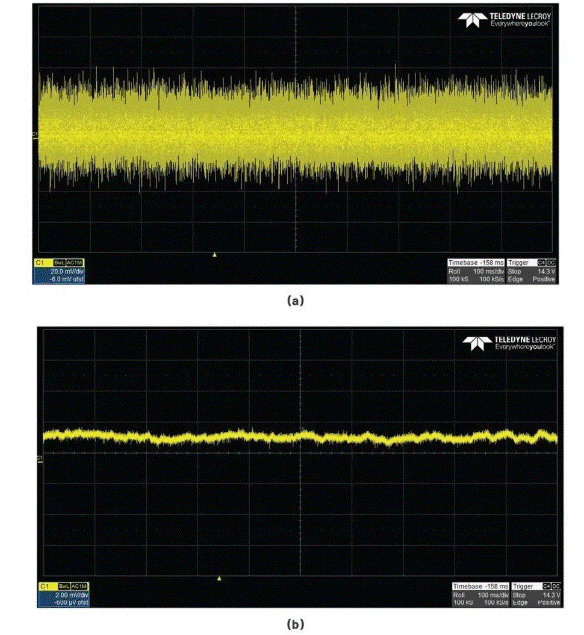 圖3.濾波之前和之后。(a)在C4處(濾波之前)測(cè)量時(shí),升壓穩(wěn)壓器輸出的噪聲含量約為0.2%。