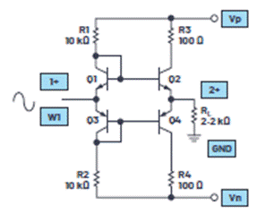 開始之前,請確保關(guān)閉ADALM2000上的電源。電路和實驗室硬件的連接如圖1所示。示波器輸入1應(yīng)連接到Q1和Q2基極的接合處。示波器輸入2應(yīng)連接到Q1和Q2發(fā)射極的接合處。