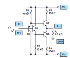 Q3提供。電阻R1和R2提供偏置電流,并設(shè)置流入輸出器件Q2和Q4中的空閑電流。