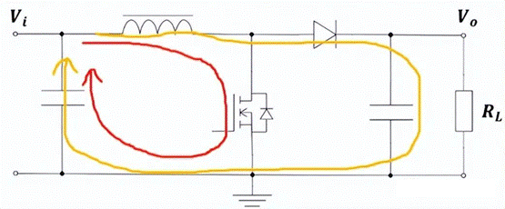 下面是Boost升壓DC/DC電路電流環(huán)路的情況,來(lái)聊聊電感底部敷銅對(duì)電源設(shè)計(jì)的影響。