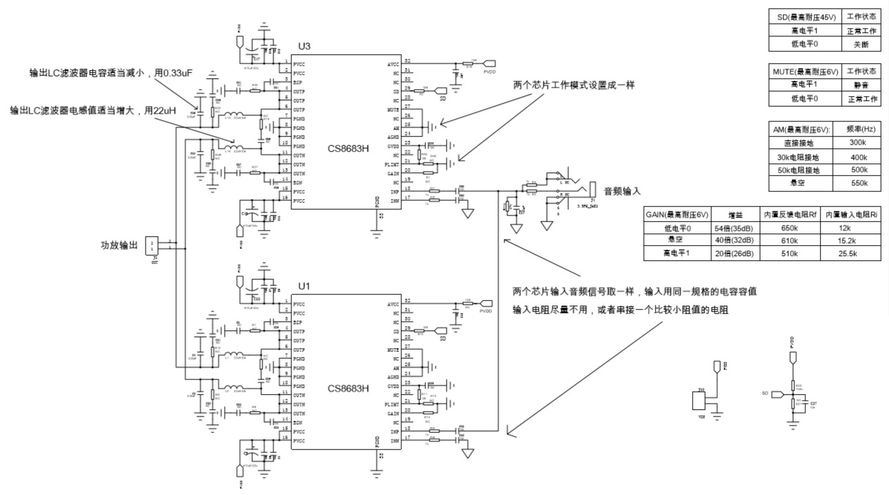 CS8683H兩個(gè)功放芯片輸出經(jīng)過LC低通濾波器之后直接并聯(lián),驅(qū)動能力加倍,負(fù)載阻抗可降低,提升輸出功率?梢詫(shí)現(xiàn)36V供電單聲道200W/4歐持續(xù)功率輸出。