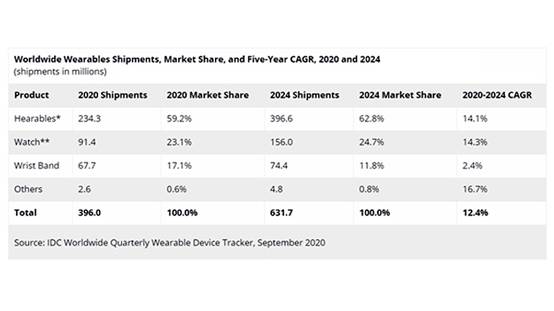 根據(jù)IDC發(fā)布的最新數(shù)據(jù),2020年全球可穿戴設(shè)備的出貨量預(yù)計可達(dá)到3.96億臺,與2019年相比增長14.5%。如果從可穿戴細(xì)分市場來看,可聽式穿戴設(shè)備(Hearables)占到了總出貨量的近六成,表現(xiàn)十分搶眼。