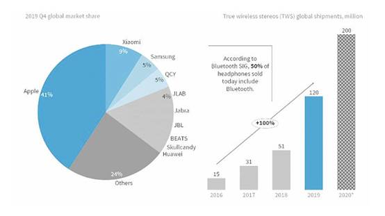 圖2:全球TWS耳機(jī)市場走勢及各廠商市場占有率(資料來源:IDC)