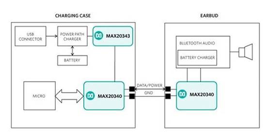 圖4:MAX20340僅需要兩個引腳即可實現(xiàn)耳機(jī)和充電盒之間的數(shù)據(jù)和電源傳輸(圖源:Maxim)