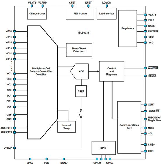 圖6:ISL94216x電池前端IC系統(tǒng)框圖(圖源:Renesas Electronics)