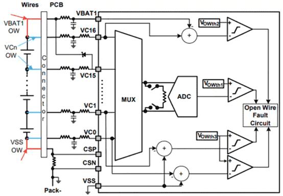 開路檢測是BMS自診斷中一項很重要的功能,一旦連接器和電池組斷開連接,BMS將不能繼續(xù)提供系統(tǒng)監(jiān)測和調(diào)節(jié)功能,如果此時其他電路繼續(xù)工作,不僅會損害電池組,甚至?xí)斐墒鹿省?/span>