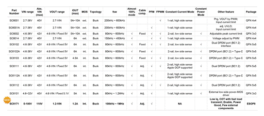 南芯已推出包括SC8102、SC8112、SC8701、SC8001/2等多款DC/DC電源管理芯片,完美適用于車(chē)規(guī)、多口墻充、適配器、HUB和工業(yè)應(yīng)用等多場(chǎng)景。近期更是隆重推出集成Power MOS的同步升降壓變換器SC8723/SC8724,支持最大22V的輸入及輸出電壓,無(wú)論是輸出電壓高于、低于或等于輸入電壓,都能提供出色的電源效率和電壓調(diào)節(jié),非常適合USB PD、USB-HUB、移動(dòng)電源、適配器等應(yīng)用。在工業(yè)電源應(yīng)用中,SC8723 /SC8724同樣可以成為滿足需求的最佳選擇。