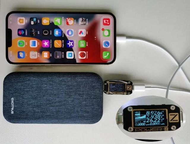 采用天寶30W充電寶經(jīng)過Chargerlab POWER-Z KM001C測試儀連接到iPhone13進(jìn)行PD快充。從實(shí)測結(jié)果看,充電寶輸出8.92V,電流2.94A,到iPhone13的功率接近27W。