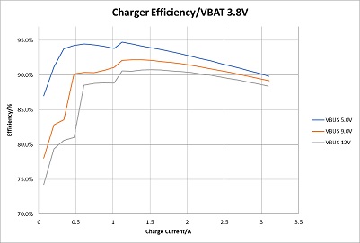 此外通過效率曲線可以看到,當(dāng)以9V或者12V輸入時(shí),其中1-3A充電電流范圍內(nèi),效率均保持在87%以上;而對(duì)于常見的9V2A、12V1.5A的快充狀態(tài),轉(zhuǎn)換效率均在90%以上。