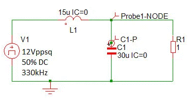 在圖 1中,降壓轉(zhuǎn)換器電源系統(tǒng)由一個 12V 峰峰值方波發(fā)生器表示,該發(fā)生器具有 50% 占空比和 330kHz 頻率。LC 濾波器由一個 15µH 電感器和一個為 1Ω 負載供電的 30µF 電容器組成。