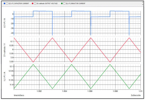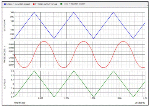 電路用Simplis 仿真,主要波形如圖2所示。藍色波形是以零為中心的 +/-300mA 峰峰值的三角電容器電流。紅色波形是以 6V 為中心的輸出電壓,具有 +/-4mV 幅度的完美正弦電壓紋波。綠色波形是 6A 的電感電流,紋波為 +/-300mA。自然,電感器和電容器的紋波電流是相同的,因為負載電流是恒定的。